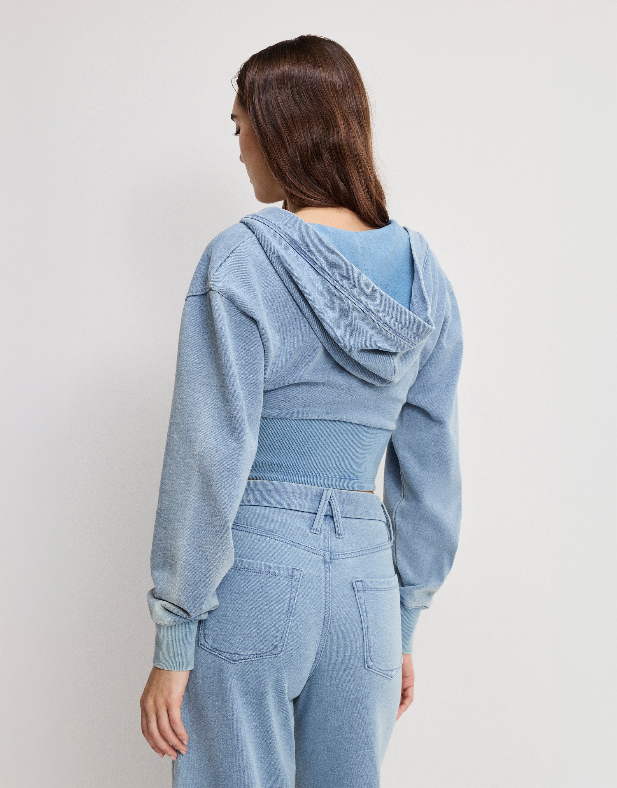 This cropped zip-front hoodie is designed with a flattering, contoured fit that elevates your everyday lounge look. Made from a soft knit fabric with a denim-inspired feel, it layers easily while still standing strong on its own. Wear it zipped up or slightly open for an effortlessly cool vibe.