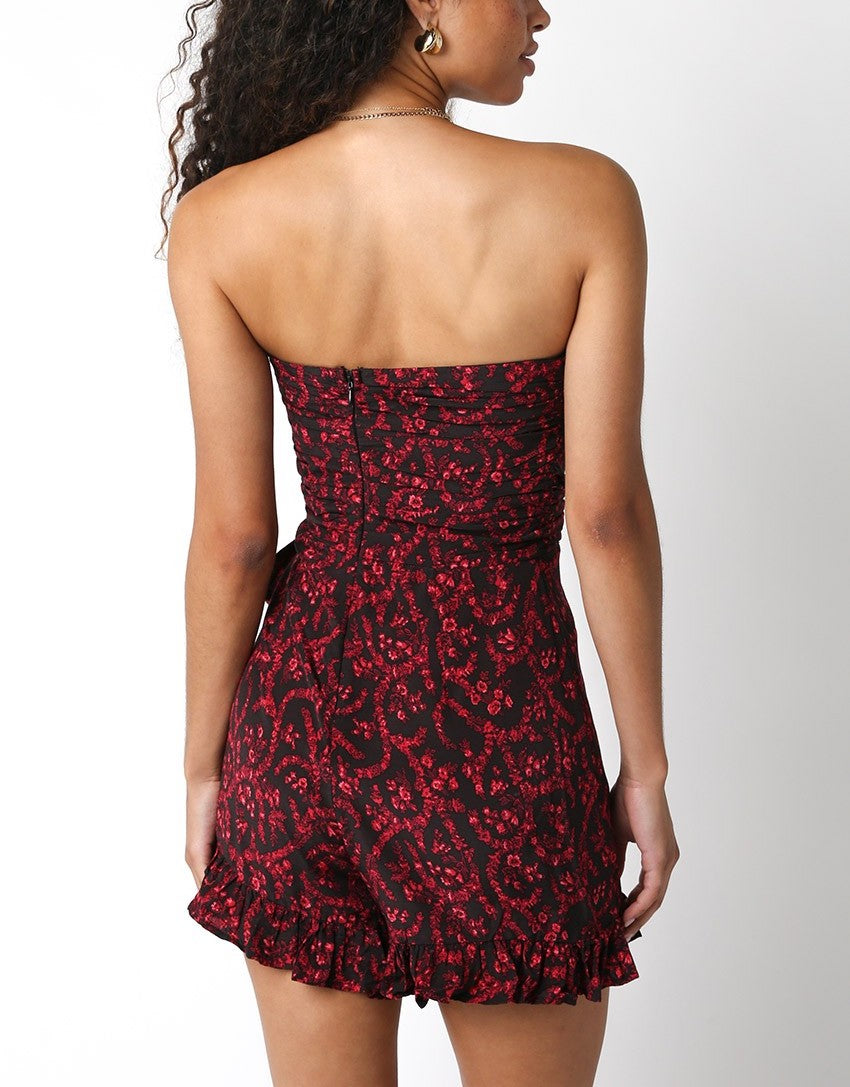 This strapless romper features a printed design with a wrapped waist and ruffle hem, wear it with boots and leather jacket for a cool edgy look or heels and a cardigan for something more tailored.