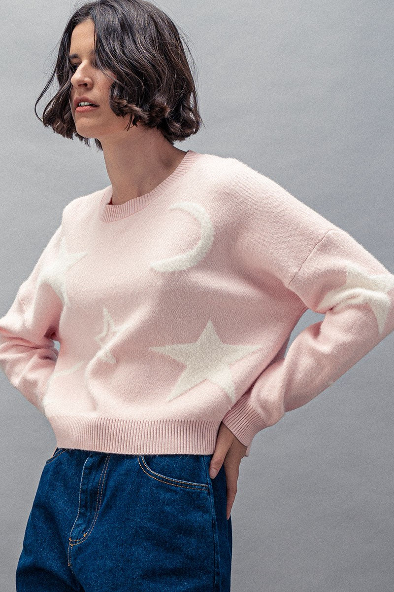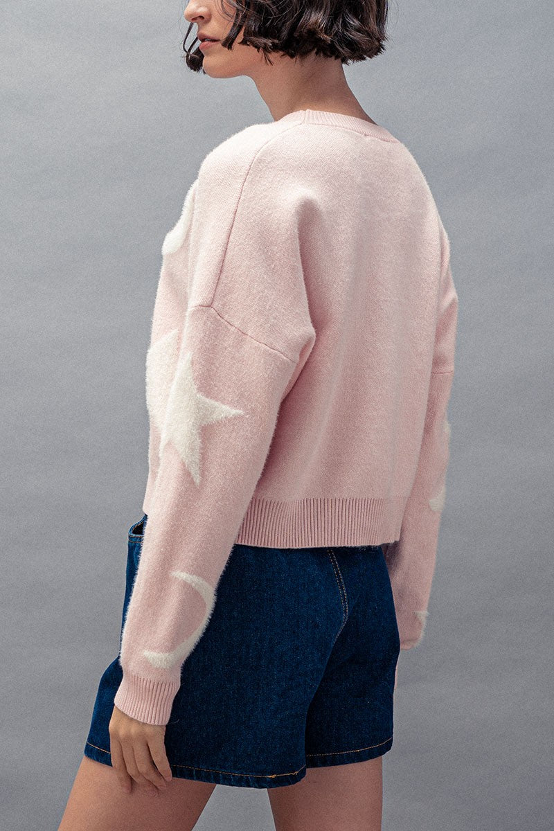 A little cozy, a little playful — this star sweater is the perfect feel-good knit. Designed in a soft blush pink with tonal star details, it features a relaxed silhouette and a slightly cropped length that pairs effortlessly with high-rise denim or skirts. Easy, comfy, and fun without trying too hard.