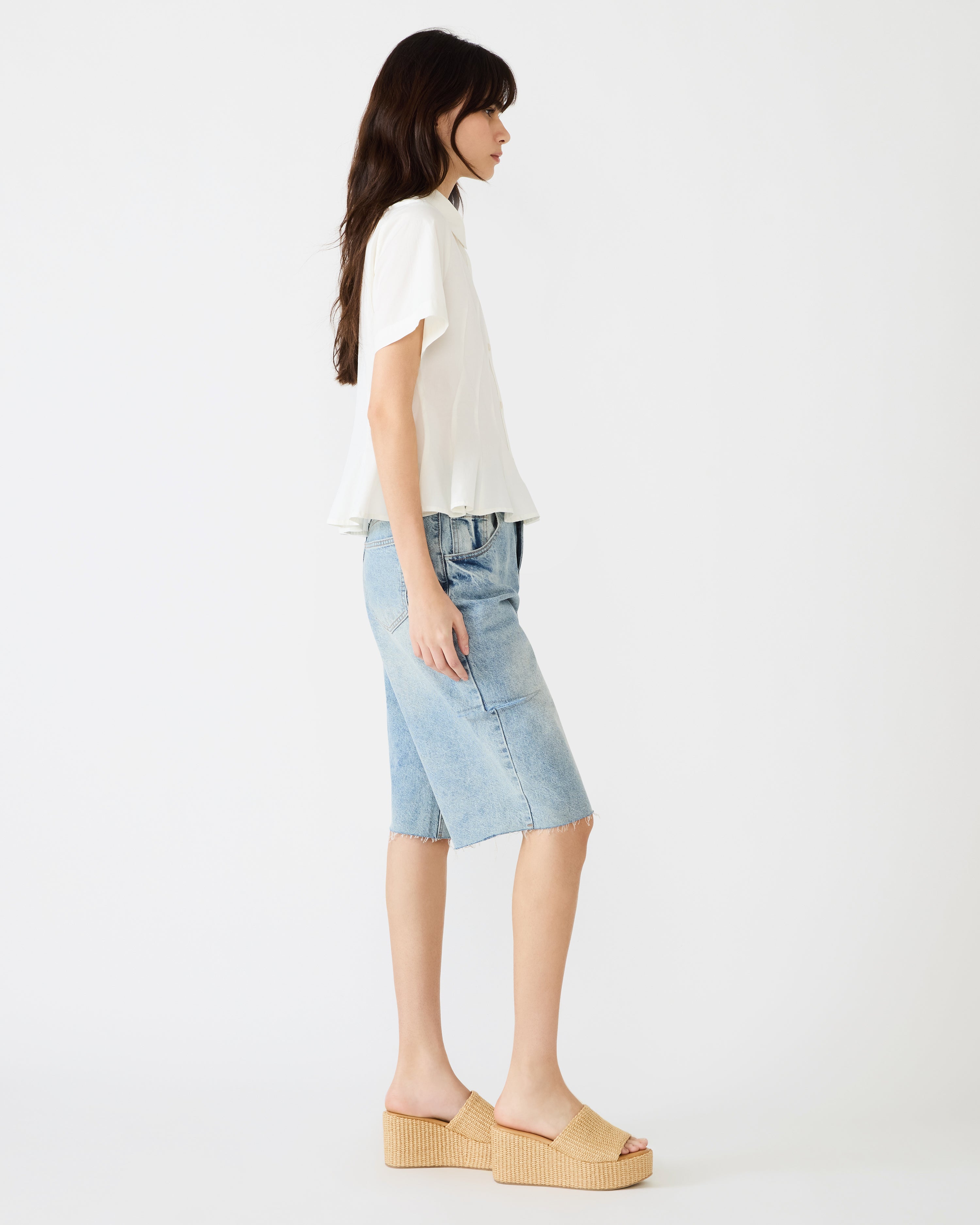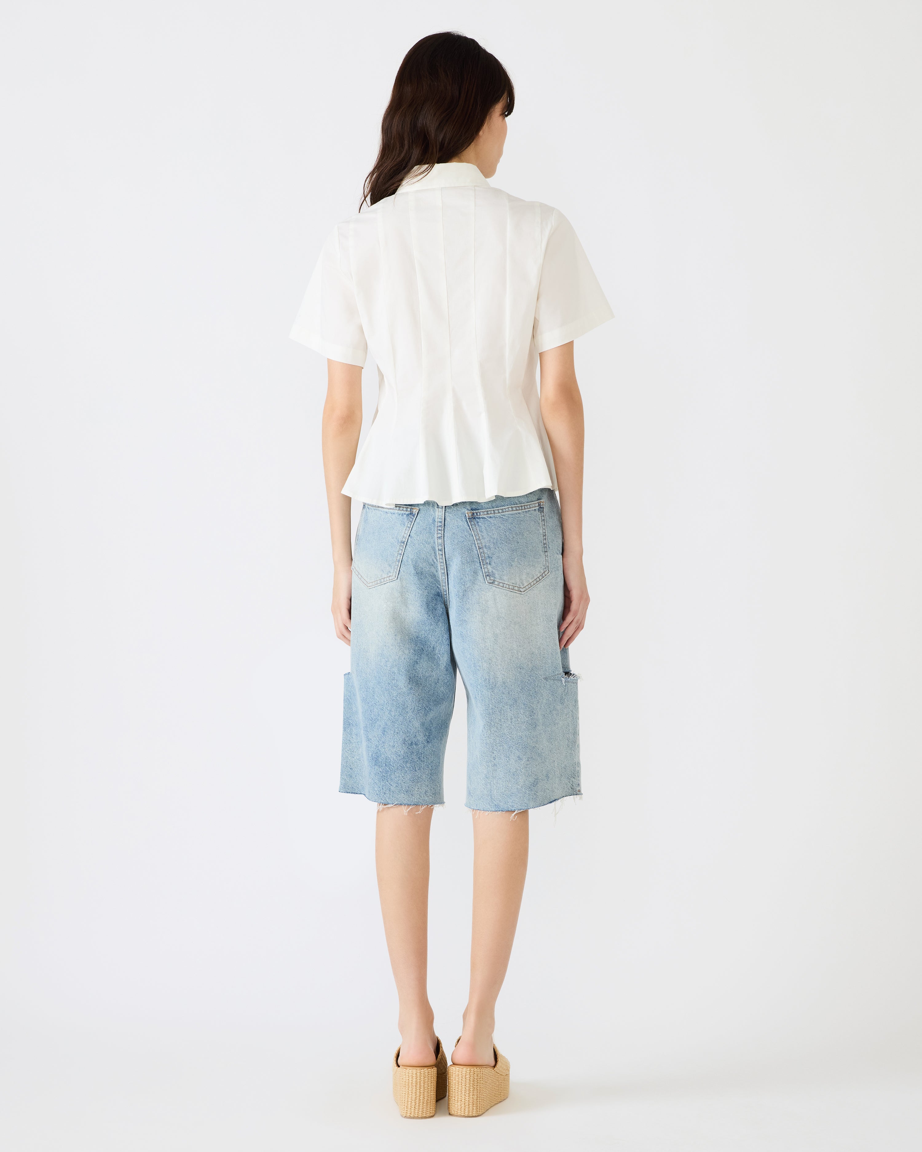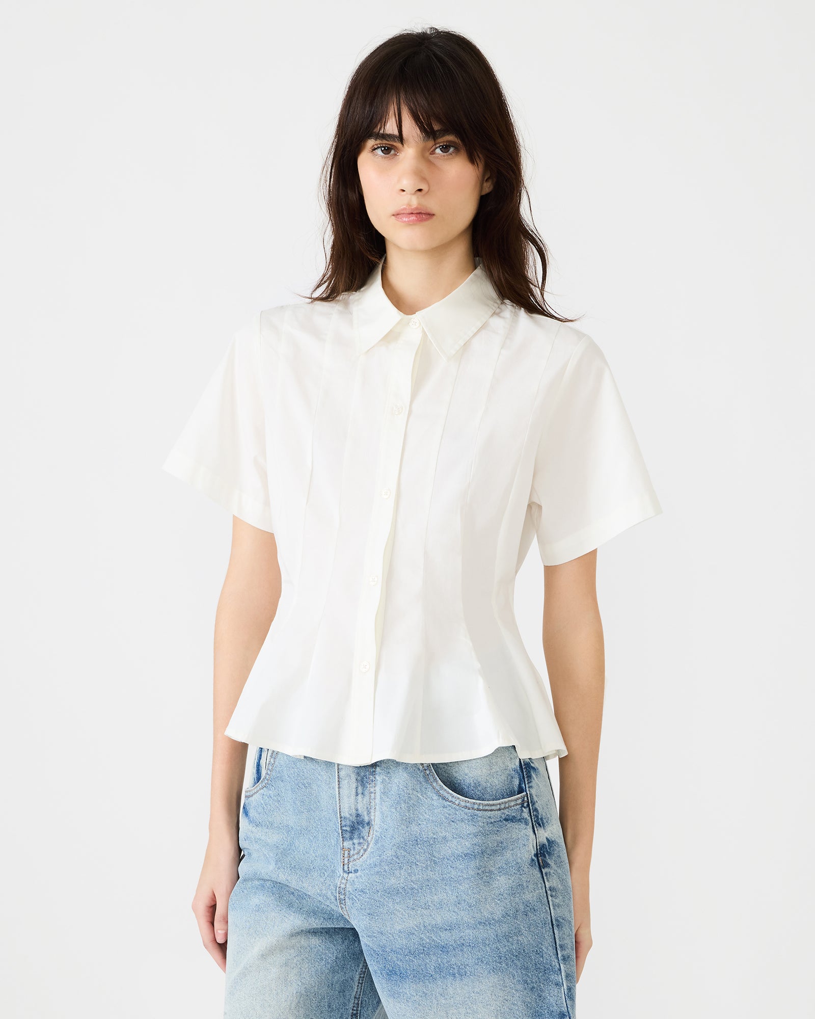 This short sleeve pintuck button-down top is designed to flatter and elevate your everyday wardrobe. Featuring a classic collar, button-front closure, and vertical pintuck detailing, it creates a beautiful, tailored look through the bodice. The slightly flared, peplum-style hem adds shape and movement for a feminine, polished finish.