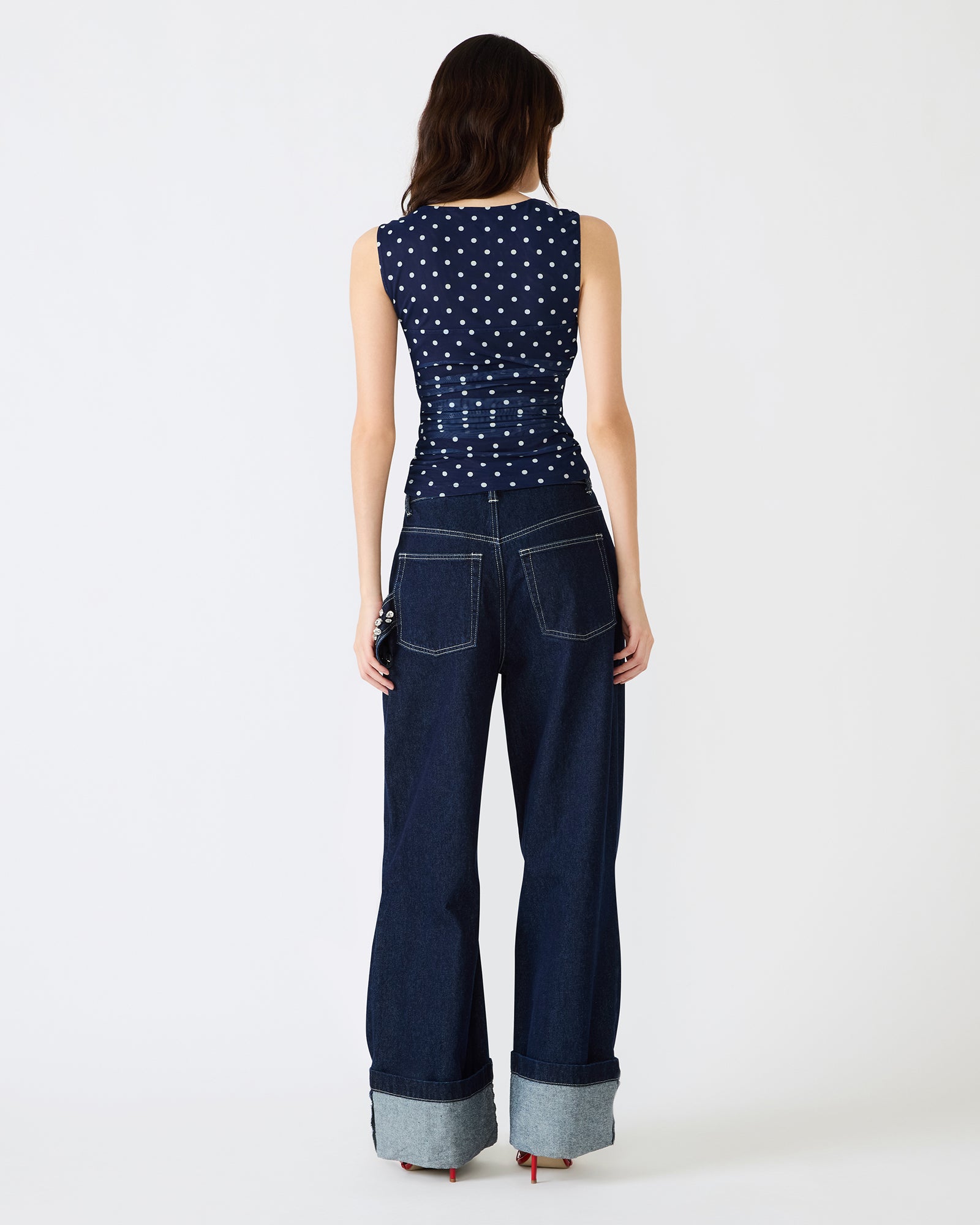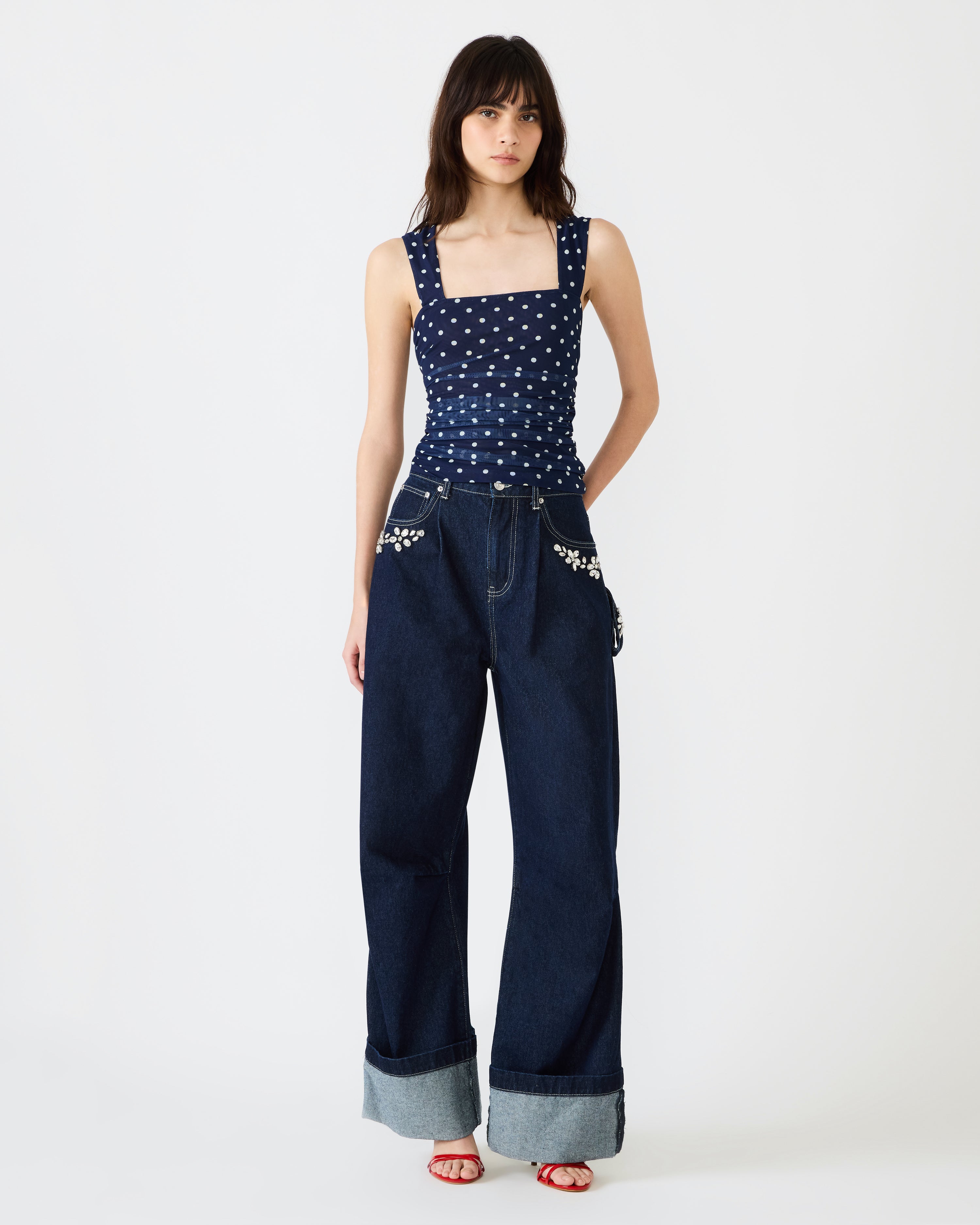 A flirty polka dot mesh top with flattering ruching for a curve-enhancing fit. The perfect statement top for nights out and elevated everyday looks.