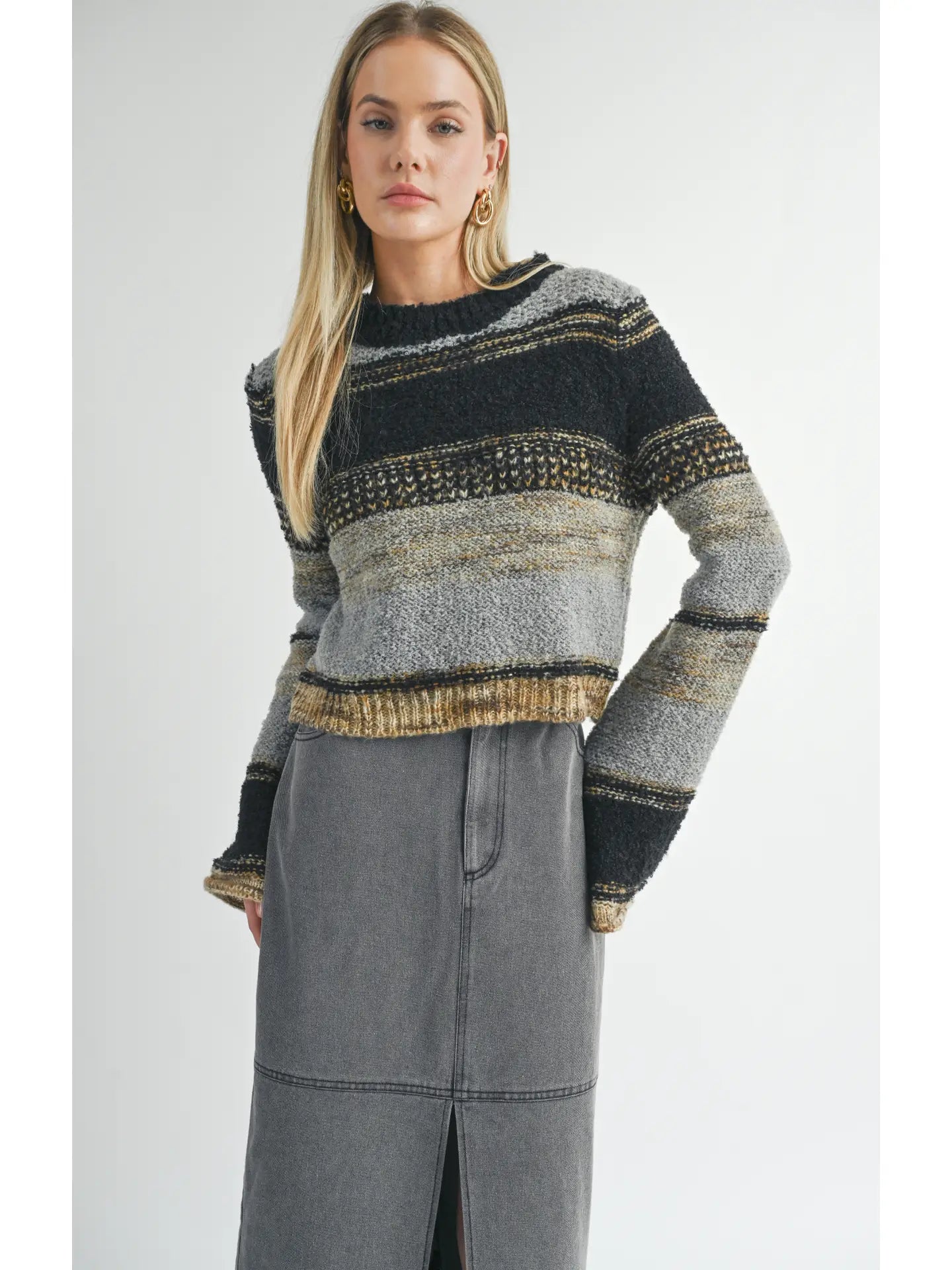 This striped knit sweater blends shades of black, grey, and gold for an effortlessly elevated look. Crafted in a soft, chunky yarn with subtle metallic threading, it’s the perfect balance of laid-back and luxe.