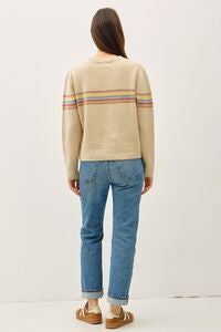 A cozy classic with a hint of color. This soft oatmeal sweater features subtle rainbow stripes across the chest and sleeves, giving it a playful, vintage-inspired feel. With its relaxed fit and midweight knit, it’s the perfect piece for layering or wearing solo with your favorite denim.