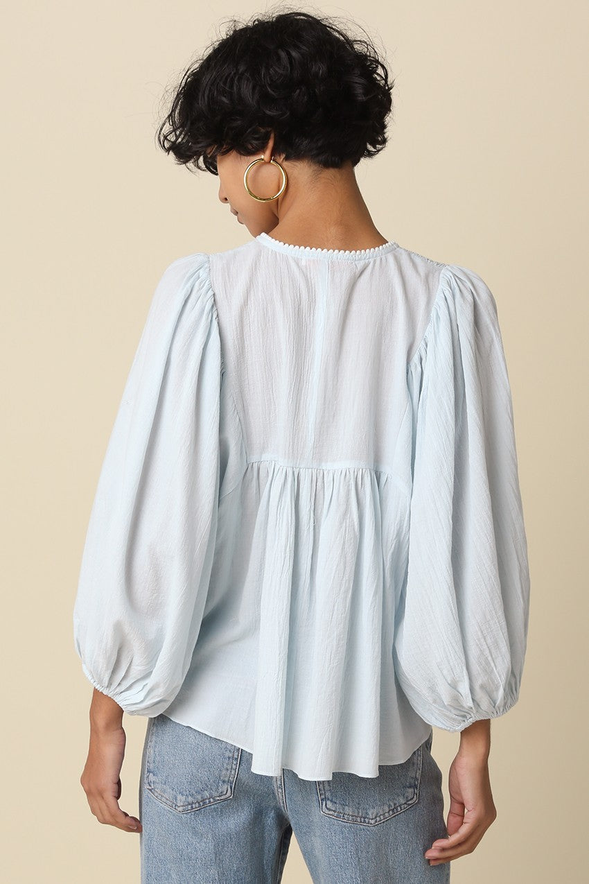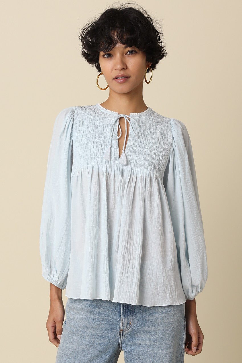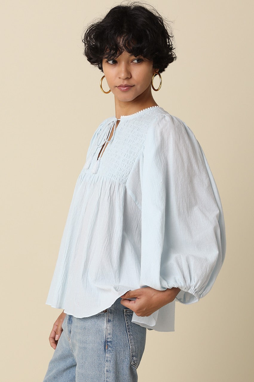 Soft, feminine, and effortlessly chic. This peasant-style blouse features delicate smocking at the neckline with a subtle tie detail for a relaxed, romantic feel. The lightweight fabric and flowy silhouette make it perfect for everyday wear, while the billowy sleeves add an elevated touch.