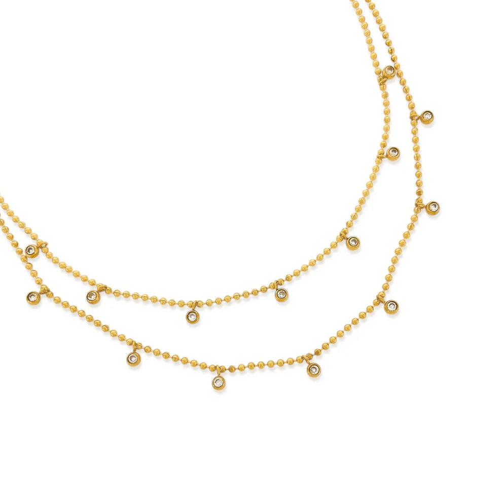 Delicate and dazzling, this gold layered necklace brings effortless sparkle to every look. Designed with double beaded chains and dainty crystal drops, it catches the light beautifully—perfect for day-to-night wear. Layer it with your favorite gold pieces or let it shine on its own.